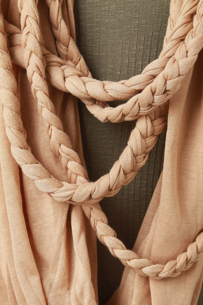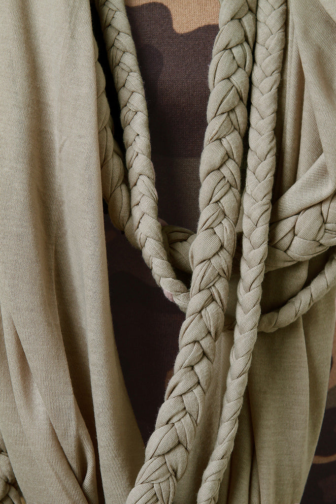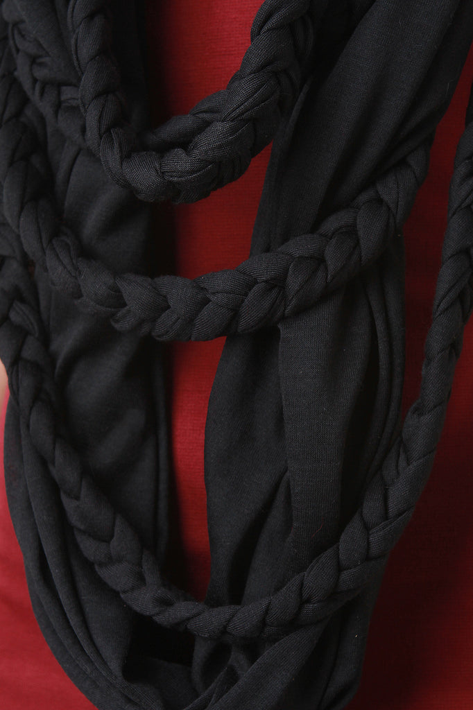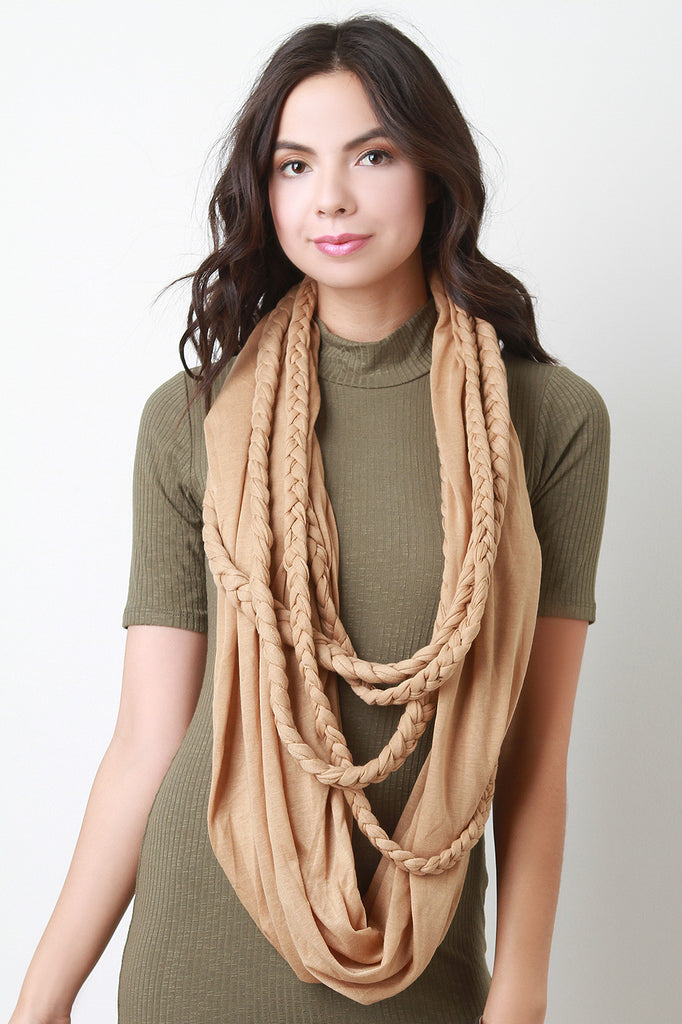 Description This unique infinity scarf features soft jersey knit and two long braided rope embellishments. 100% Polyester.