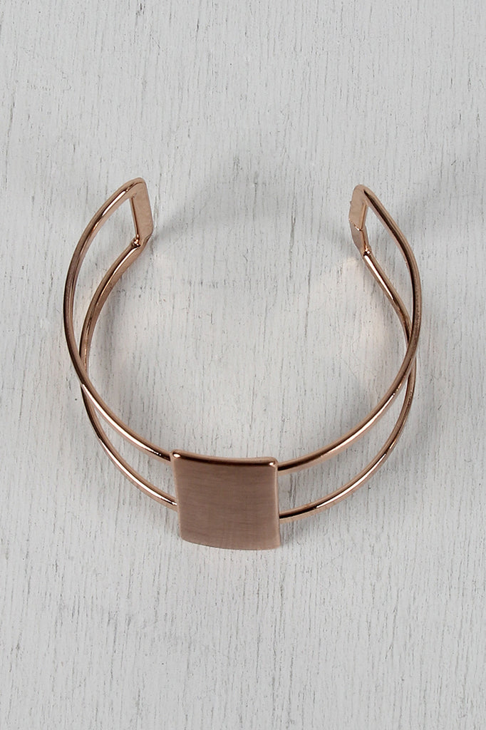 A minimalistic cuff bracelet featuring a rectangular plate centerpiece with a brushed texture on a thin metal frame. Not adjustable.