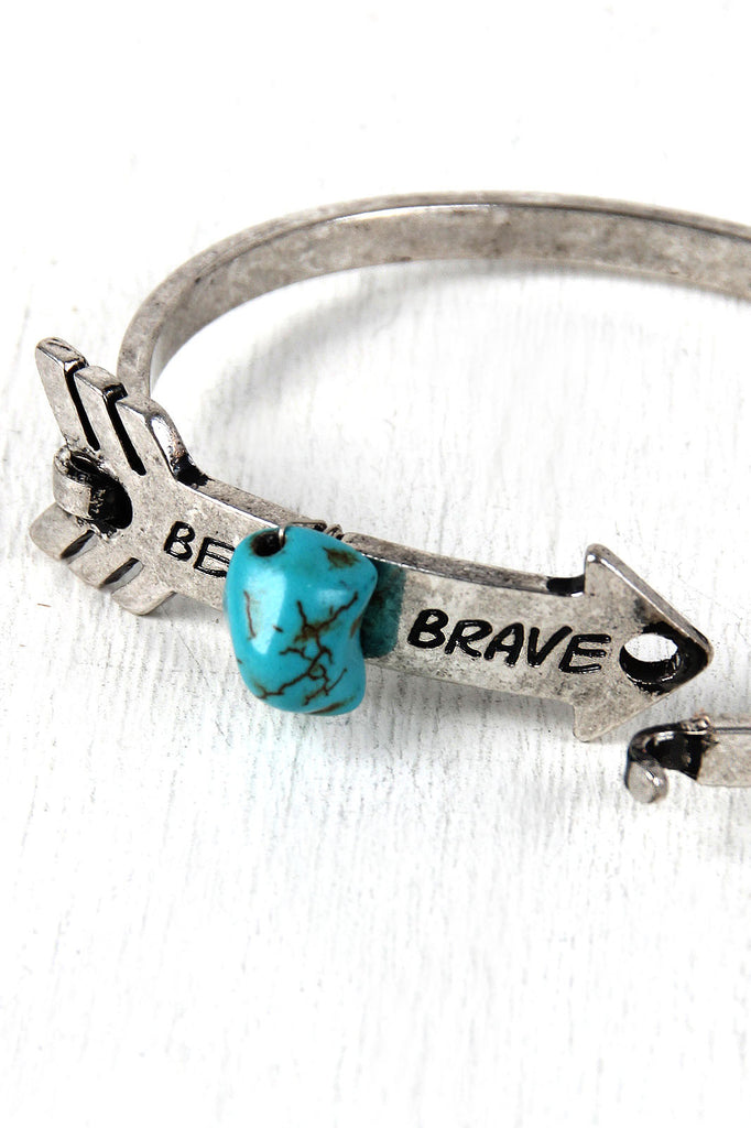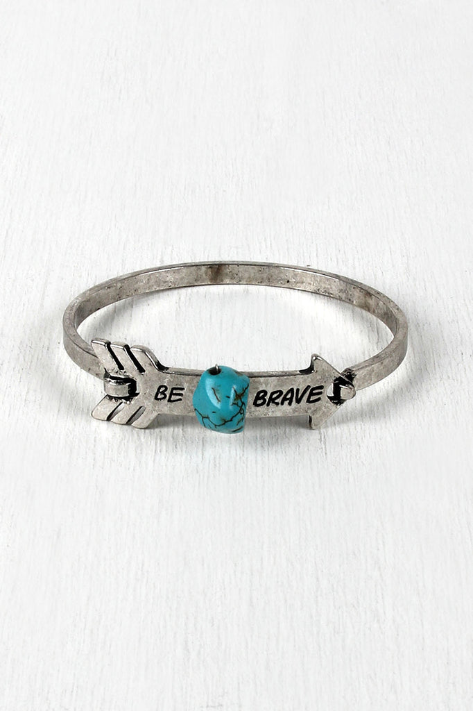 Bracelet featuring flat metal band, hinged arrow-shaped front piece with inscription and stone embellishment, and hook closure. Band is non-adjustable.