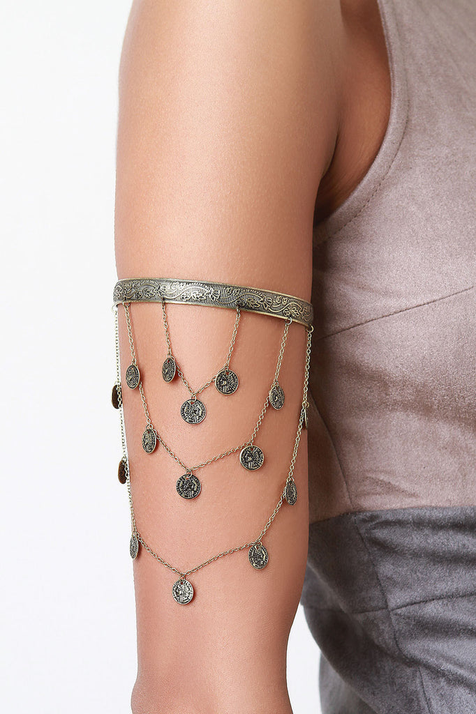 This upper arm cuff features an open-ended non-adjustable band with floral etchings and three strands of thin cable chain with faux antique coin charms.