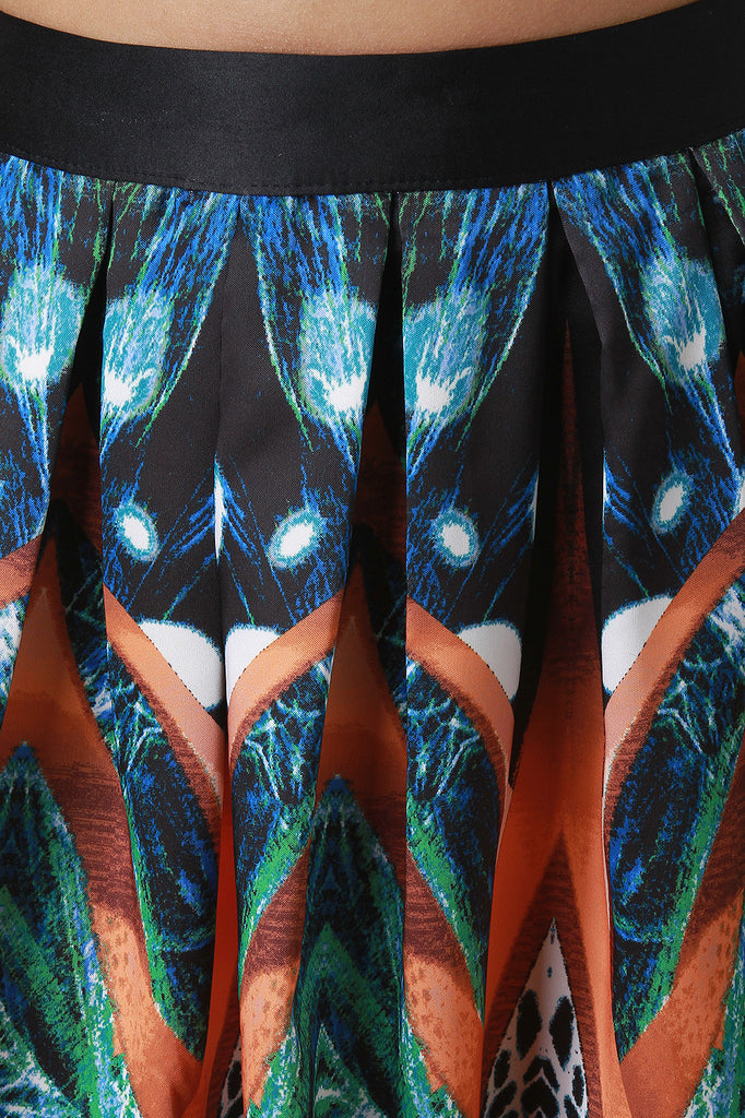 A flared print on smooth fabric, box pleats, and back zipper closure. Accessories sold separately. 100% Polyester.