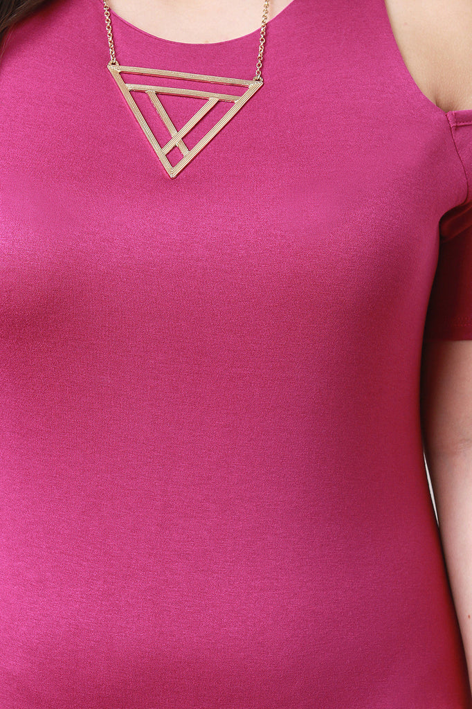 A plus size midi dress featuring a round neckline, cutout shoulder design with wide shoulder straps and short sleeves, and bodycon fit. Fully lined. Accessories sold separately. Made in U.S.A. 95% Polyester, 5% Spandex.