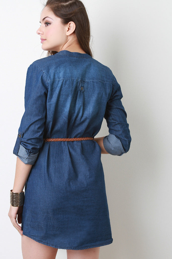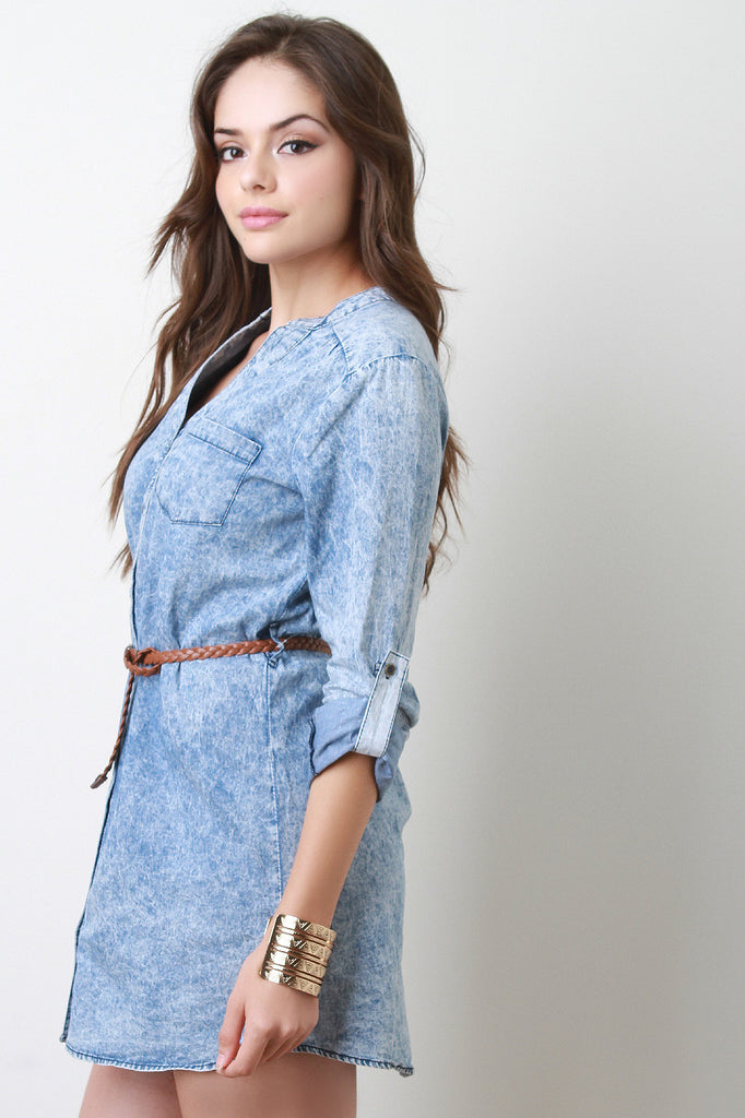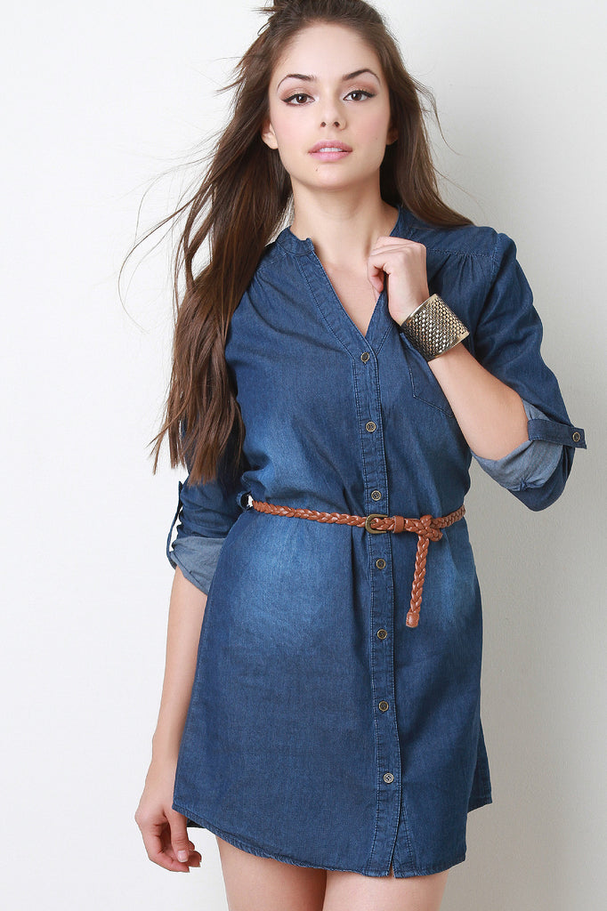 Description This casual dress features denim fabric, v-neckline, button-up front, long sleeves with button tab option, two belt loops, and removable braided leatherette belt. Accessories sold separately. 100% Cotton.