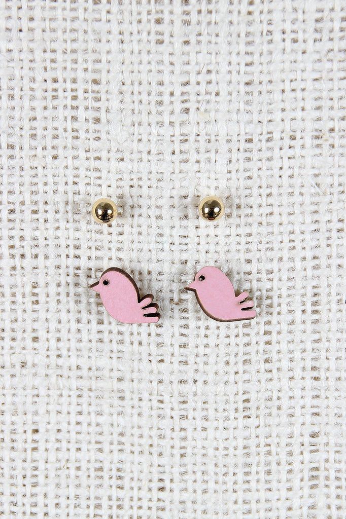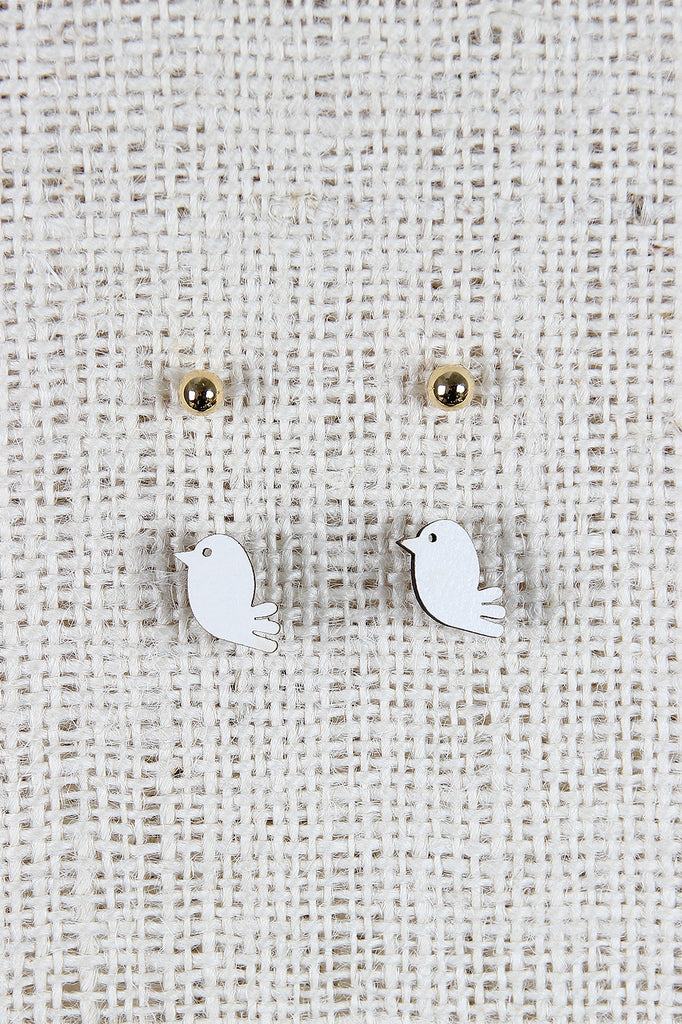 This charming earring feature two set of faux wooden birdie stud, smaller gold-tone stud, and finished with post back closure.