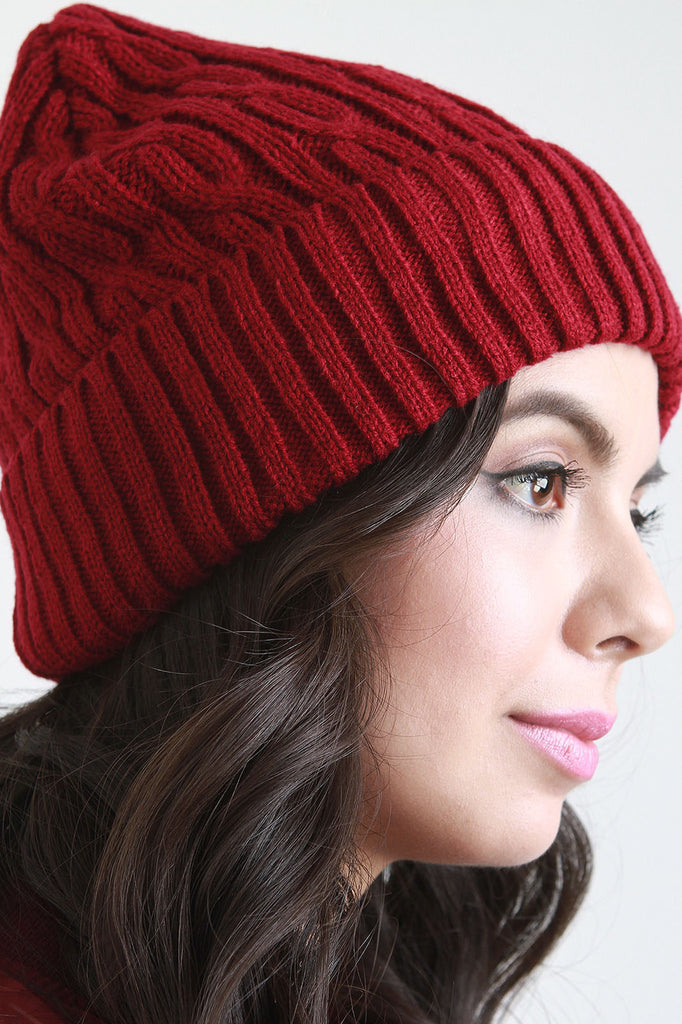 Beanie featuring solid color cable knit crown and a ribbed turned up rim.