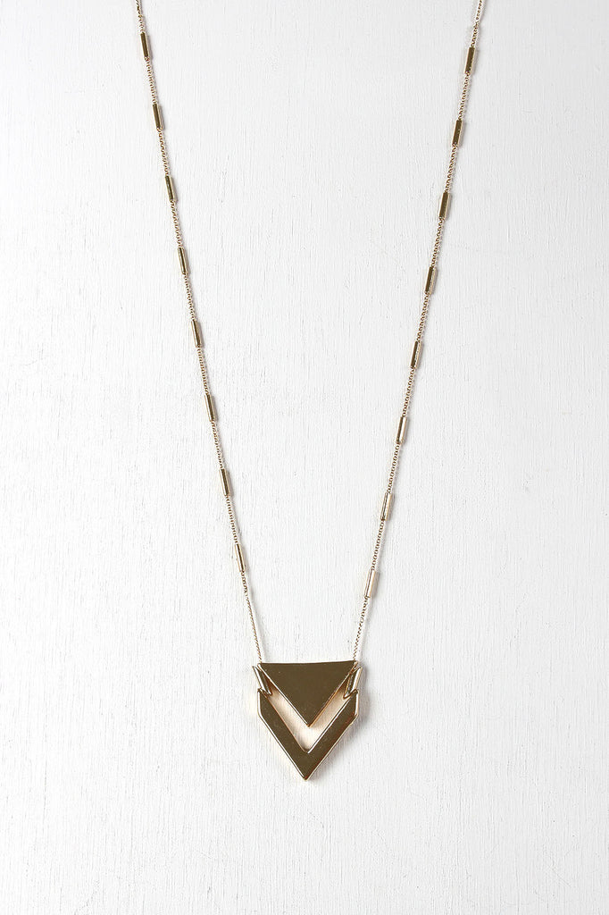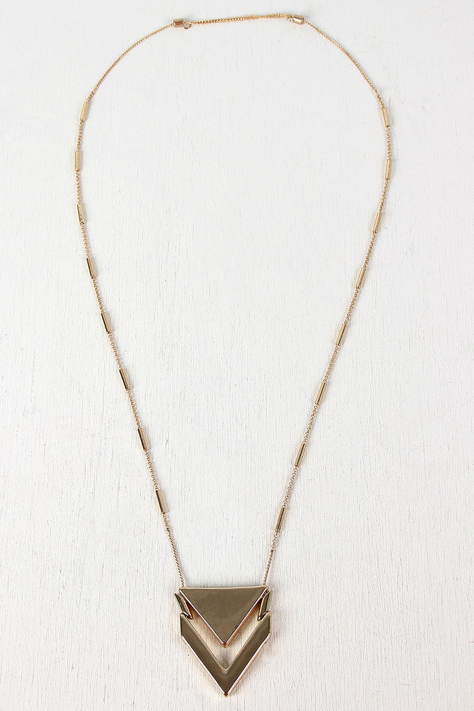 This necklace features a glossy enamel blocky chevron pendant on a station bar chain. Necklace length is adjustable with a drawstring mechanism.