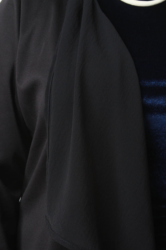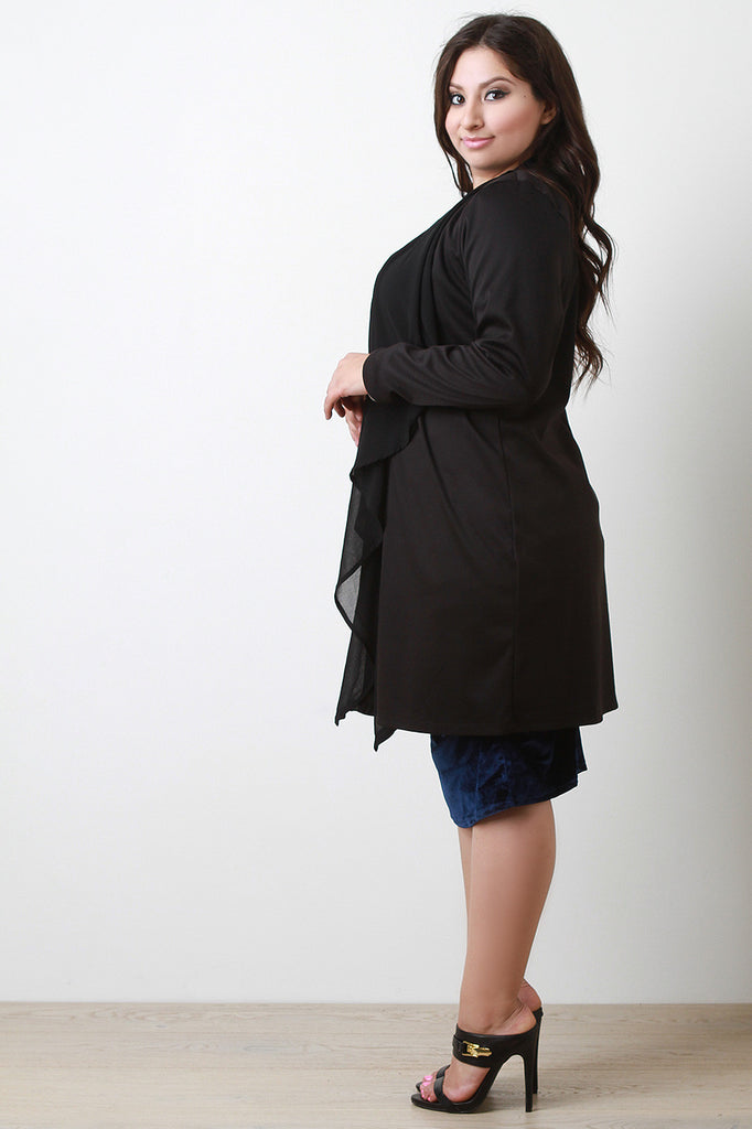 A plus size long cardigan featuring a smooth fabric main, open front with draping chiffon, and long sleeves. Accessories sold separately. Made in U.S.A. 87% Polyester, 10% Rayon, 3% Spandex. Contrast: 100% Polyester.