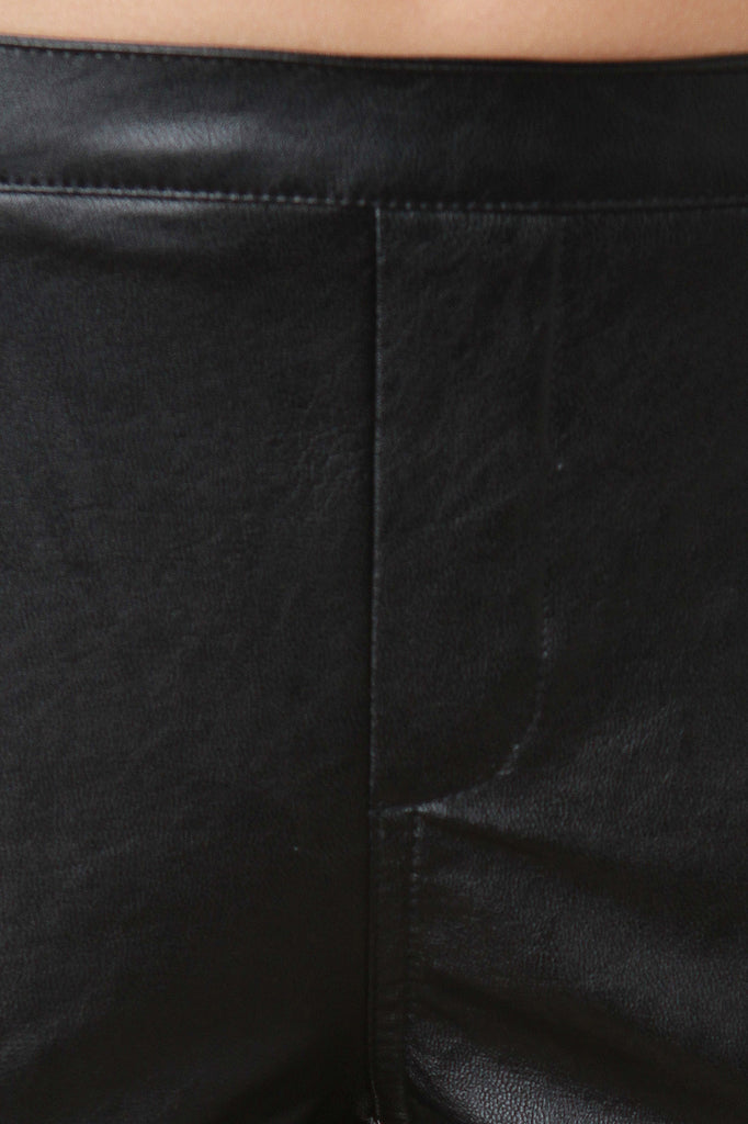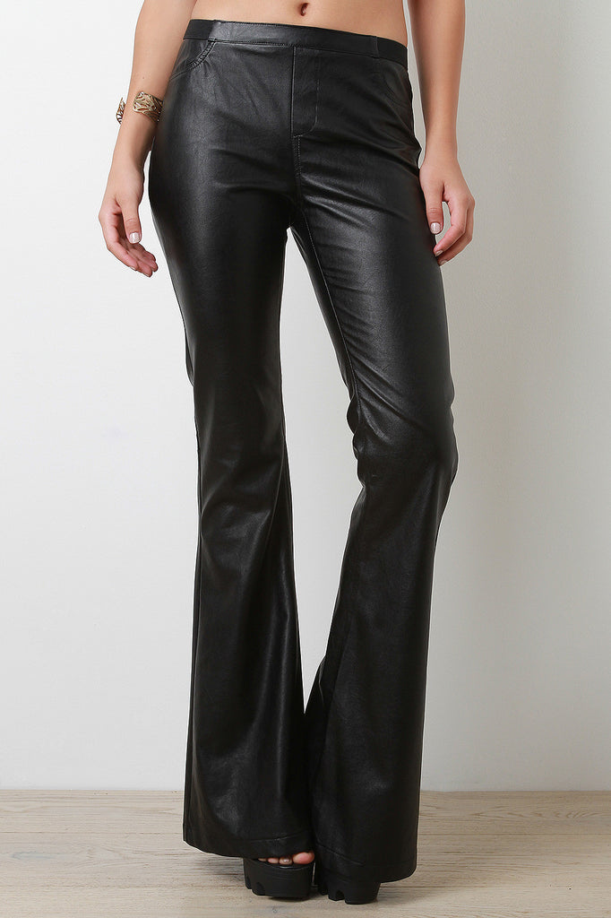 These bell flare bottom pants feature a vegan leather main, elasticized waist, two back pockets, and faux pockets at front. Accessories sold separately. Made in U.S.A. 55% Vegan Leather, 45% Cotton.