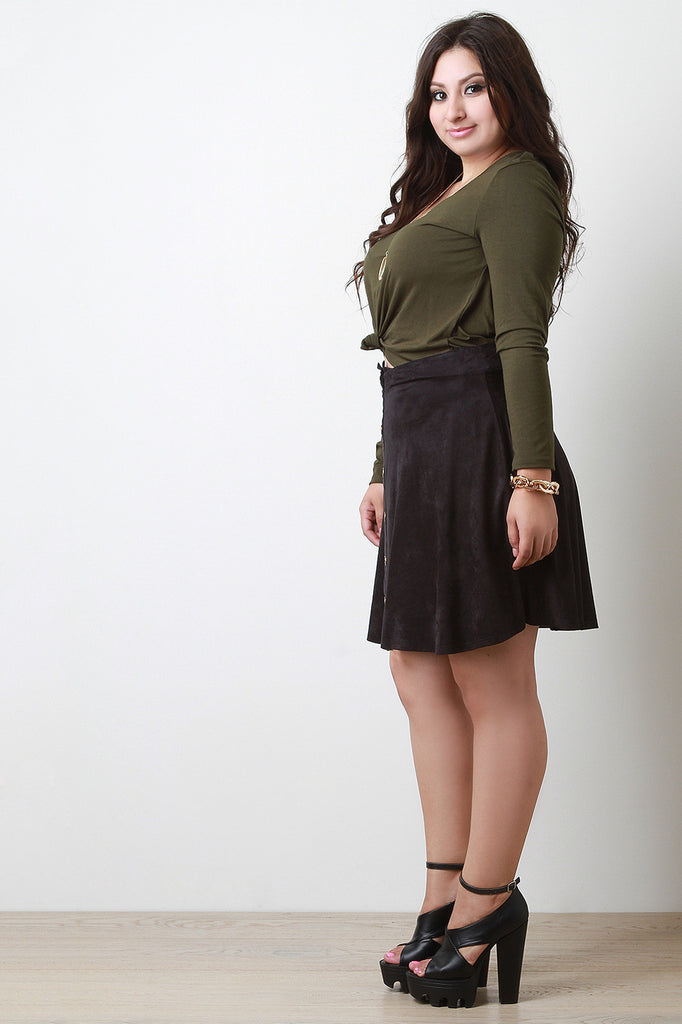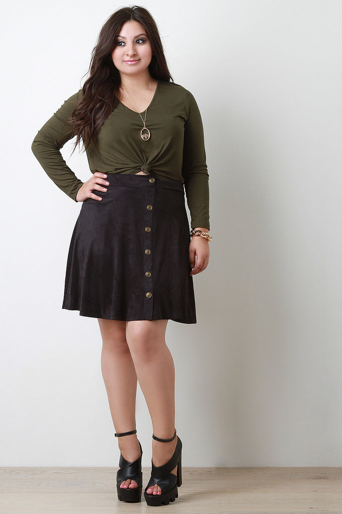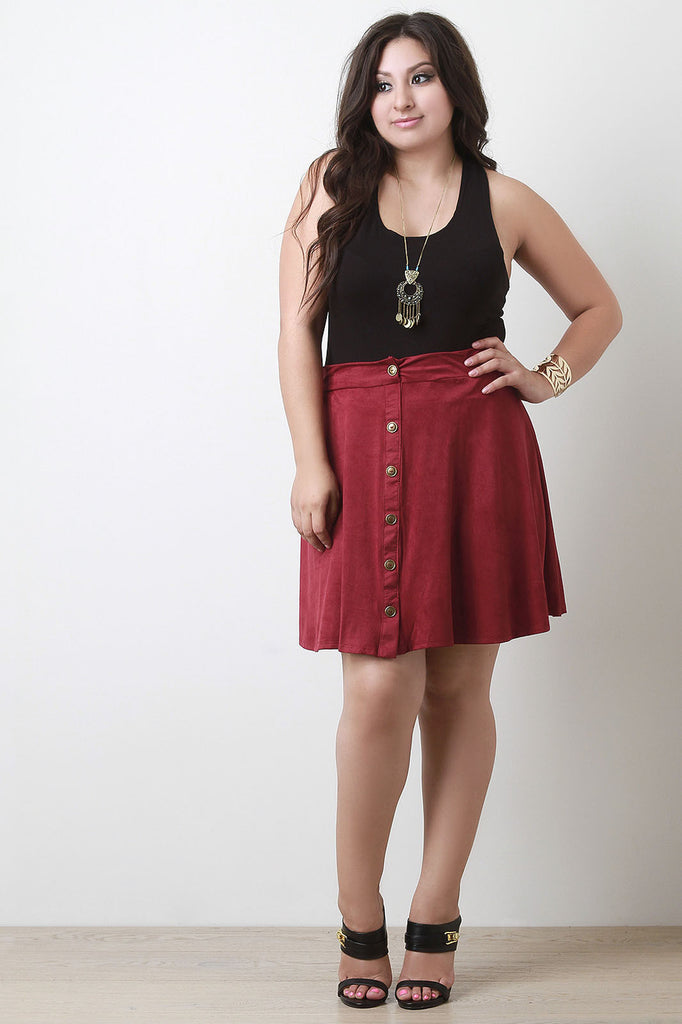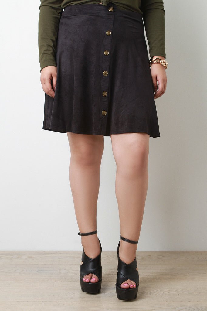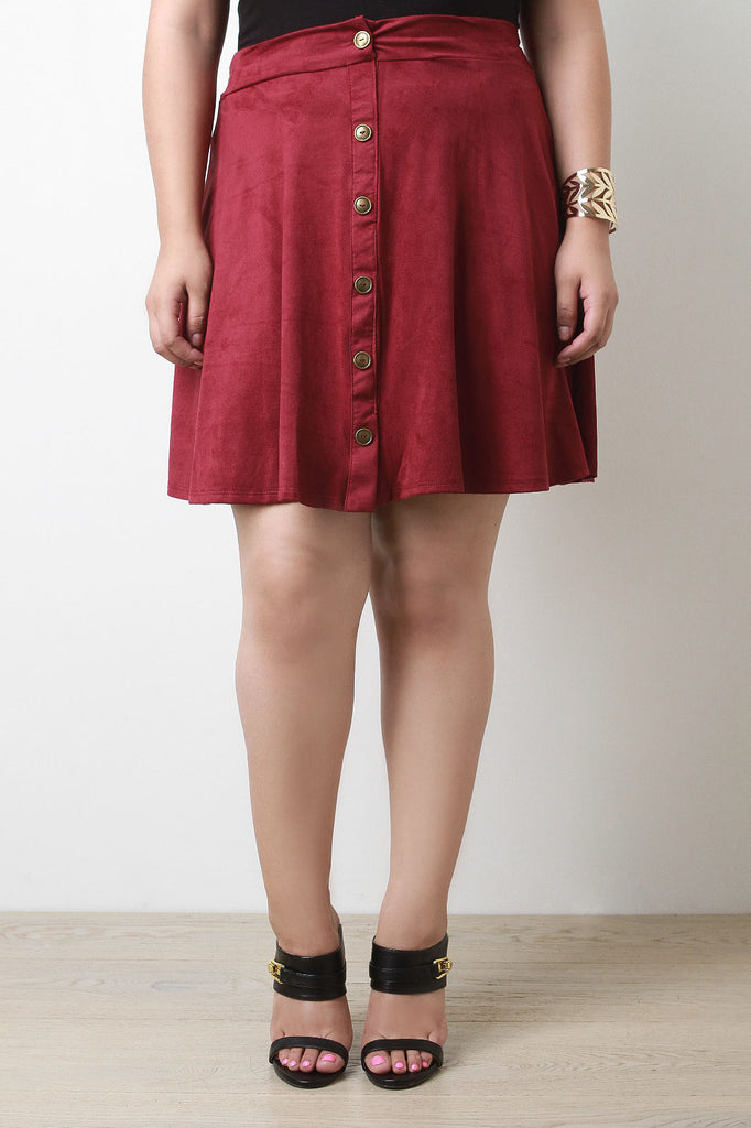 A plus size skirt featuring faux suede, A-line shape, and a faux button-down front with bronze-tone buttons. Unlined. Accessories sold separately. 90% Microfiber, 10% Spandex.